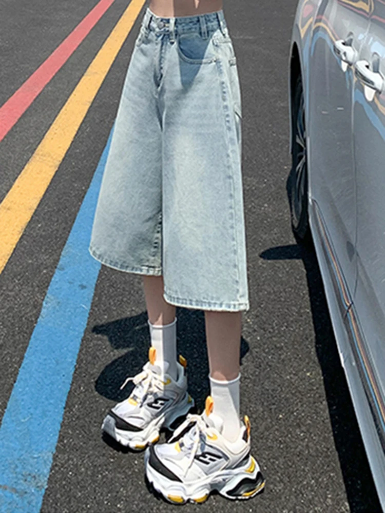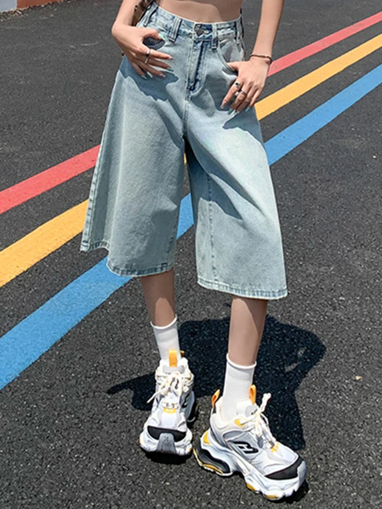 Female Summer American Vintage Baggy Denim Cropped Pants Woman High Waist Washed Wide Leg Jeans Light Blue Loose A Line Shorts