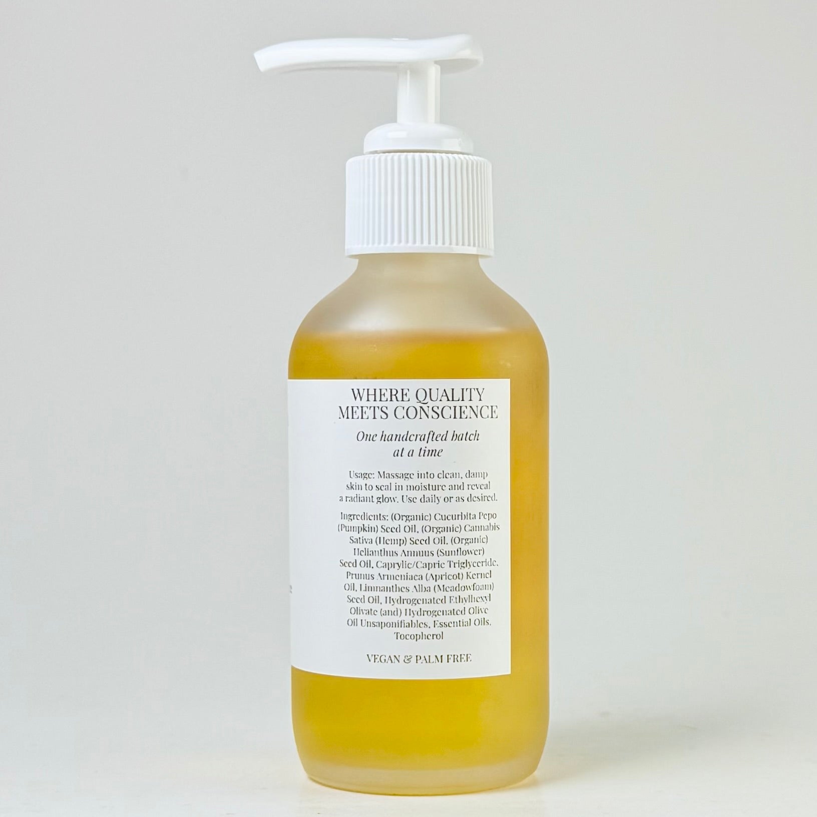 Ingredients: (Organic) Cucurbita Pepo (Pumpkin) Seed Oil, (Organic) Cannabis Sativa (Hemp) Seed Oil, (Organic) Helianthus Annuus (Sunflower) Seed Oil, Caprylic/Capric Triglyceride, Prunus Armeniaca (Apricot) Kernel Oil, Limnanthes Alba (Meadowfoam) Seed Oil, Hydrogenated Ethylhexyl Olivate (and) Hydrogenated Olive Oil Unsaponifiables, Essential Oils, Tocopherol