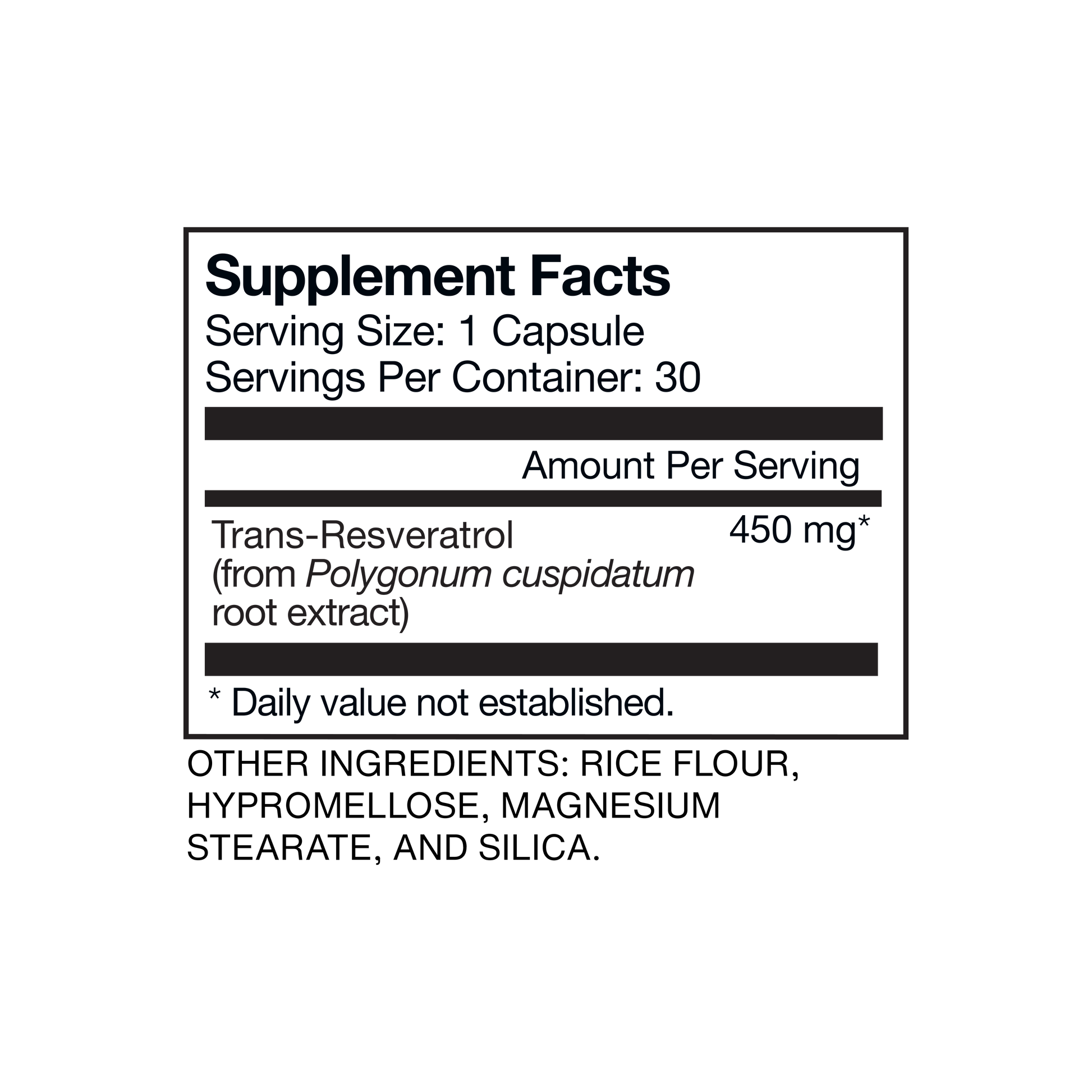 Resveratrol is a plant-based polyphenol typically found in grape juice with powerful antioxidant and anti-inflammatory benefits. Resveratrol works at a cellular level to activate various genes and proteins associated with longevity and optimal health. It helps combat oxidative stress, reduces inflammation, and supports the body's natural defense systems. We source our Resveratrol from high-quality polygonum cuspidatum root extract and ensure we deliver the proper dosage for safe and effective use.