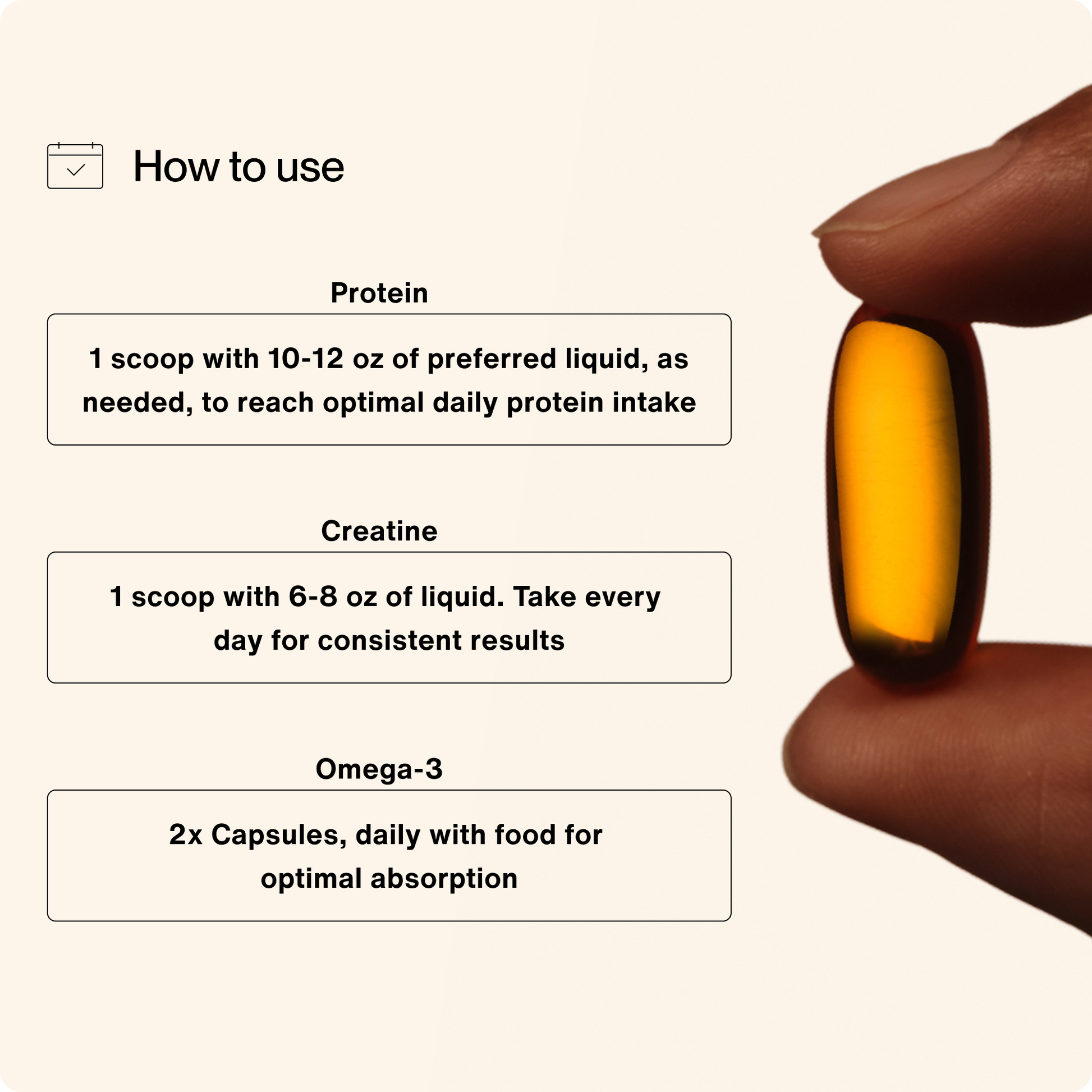 Protein supports muscle performance, growth, and immune function. Creatine serves as the main source of energy for your body—available for use by your muscles and brain—contributing to improved physical endurance and cognitive function over time. Omega-3s are polyunsaturated fatty acids that live in your cell membranes and are critical in impacting inflammation, muscle recovery, and brain health and function.