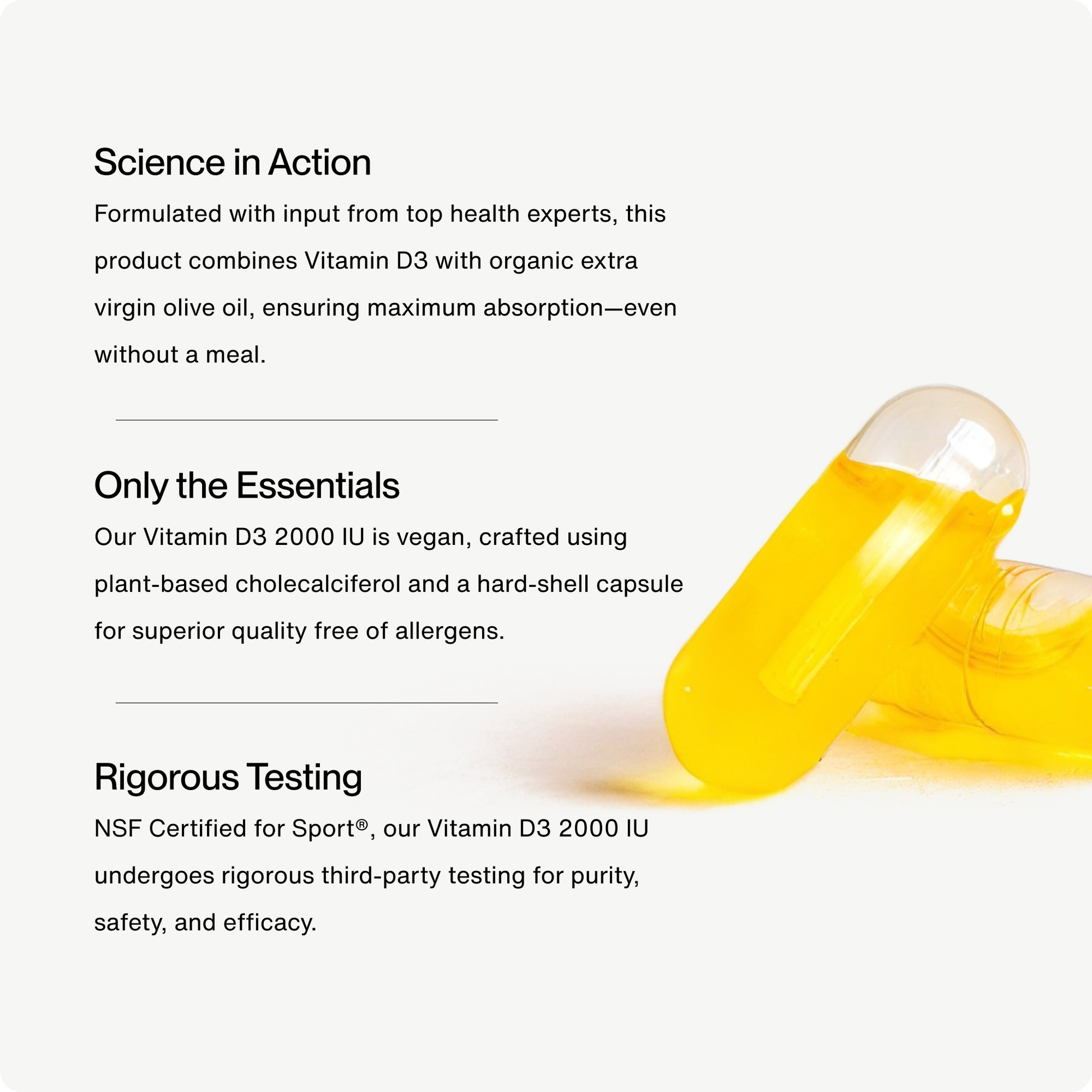 Vitamin D3 2000 IU is a vegan-friendly, allergen-free formula delivered in organic extra virgin olive oil for optimal bioavailability. Designed for daily use, this supplement supports bone health, immune defense, muscle function, and a healthy inflammatory response.